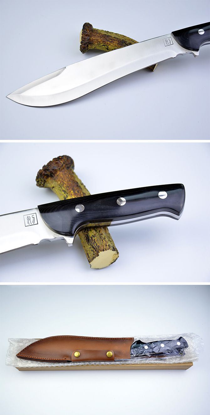 全 长: 42cm 刃 长: 27 刃 宽: 5cm(最宽处) 柄 长: 15cm 刃 厚: 0.6cm 刃 材: 440 硬 度: 57RHC 表 面: 丝光 柄 材: 刀身贯穿刀柄,三口坚实的钢钉铆住两面黑木 净 重: 905克(含套) 真皮压花刀套。 品 质:高品质