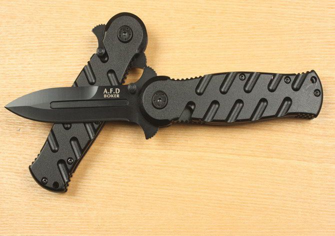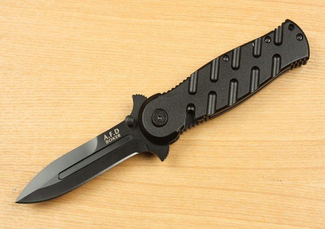 A.F.D BOKER折刺 全 长: 20cm 刃 长: 8.8cm 刃 厚: 2.8mm 刃 材: 420 硬 度: 58HRC 柄 材: 铸铝 刀 鞘: 无 锁 闭: 线锁