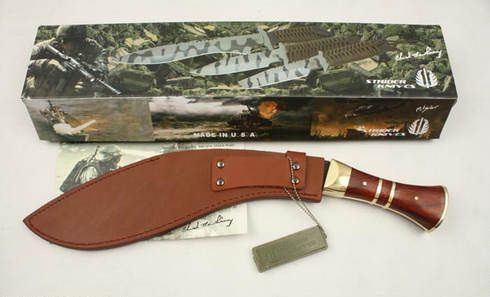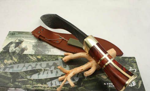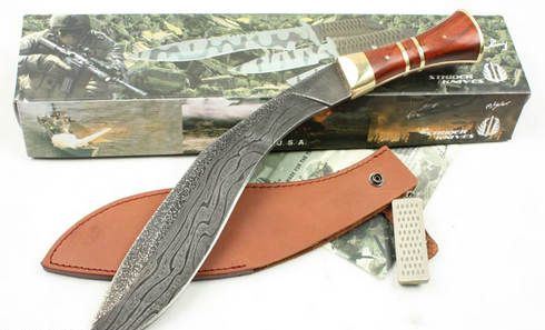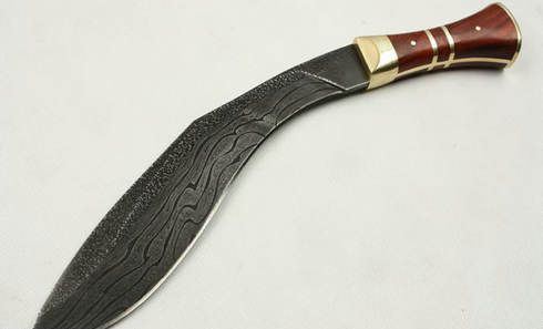 09限量版波纹钢米克狗腿 全长:42cm 刃长:28cm 刃宽:5.7cm (最宽处) 刃厚:0.6cm 刃材:新型波纹钢,手工锻打,档次相当于大马士革钢,不刮花,不变色。 硬度:58HRC 表面:不规则波纹,表面处理方法属于商业秘密 柄材:名贵酸枝木+红影木+纯铜 柄长:12.3cm 刀重:800克 总重:1100克(含包装物) 品质:高品质,刃口非常锋利 其他: 刀身贯穿至刀柄末端,用铜钉固定