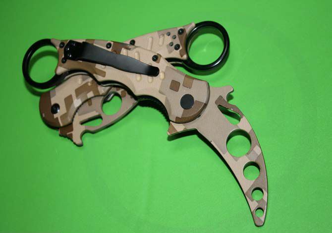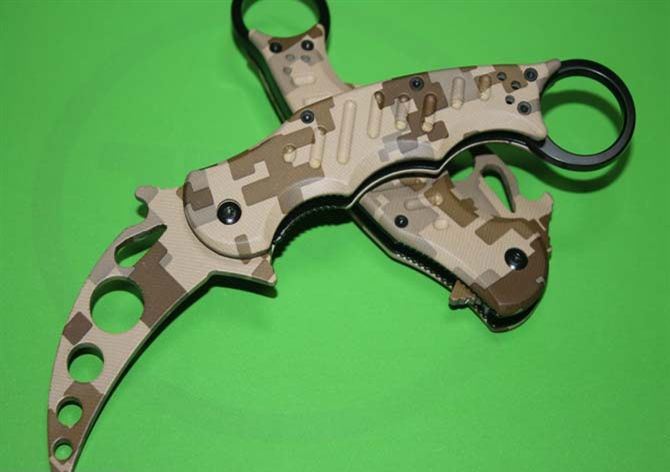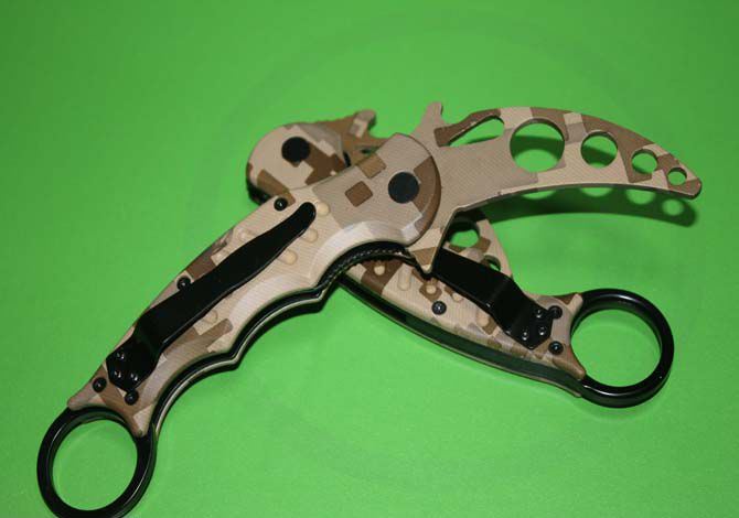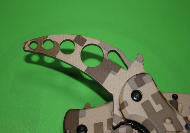全 长:19.5CM 刃 长: 7cm 柄 长: 14cm 刃 厚: 3mm 刃 材: 440C 硬 度: 56 -57HRC (实测硬度) 柄 材: 钢架+铝合金(表面披覆迷彩) 表 面:整刀表面披覆军迷彩
