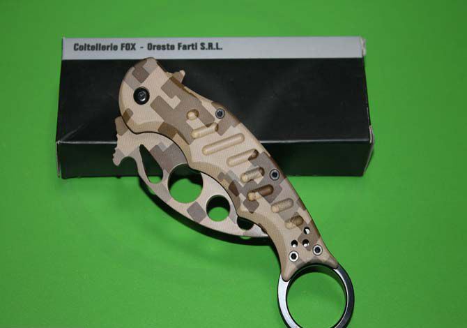 FOX(狐狸)训练鹰爪(军迷彩) 全 长:19.5CM 刃 长: 7cm 柄 长: 14cm 刃 厚: 3mm 刃 材: 440C 硬 度: 56 -57HRC (实测硬度) 柄 材: 钢架+铝合金(表面披覆迷彩) 表 面:整刀表面披覆军迷彩