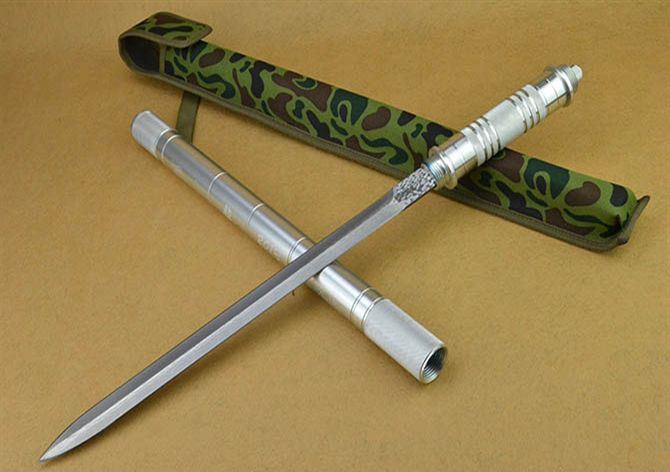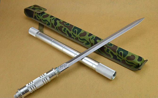 完全反接长度:95.5CM 刃长:39CM 完全正合长度:57.5CM 管径:3.2CM 刀厚:0.46CM 刃宽: 2.2CM 重量: 880g 硬度: 56HRC 刀材质:5Cr13Wov 表面腐蚀花纹 管材: 铝管 柄材: 合金铝 配件: 彩盒。高档耐磨加厚尼龙套(绿色迷彩) 附件: LED灯+电子