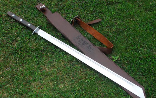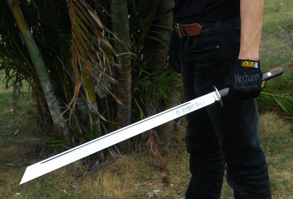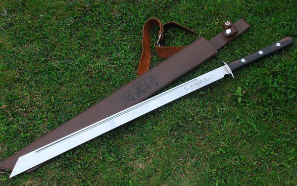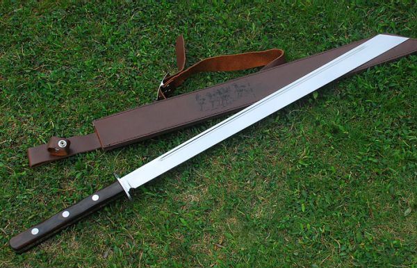 全 长:83cm 刃 长:63cm 刃 厚:6mm 刃 材:5Cr13 柄 材:彩木 硬 度:58Hrc 表 面:抛光 刀 套:牛皮 净 重:1095