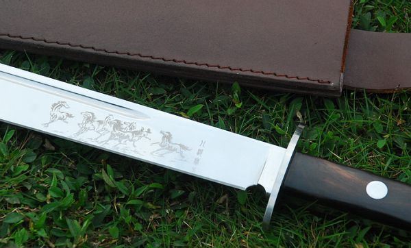 八马骏图平头砍刀 全 长:83cm 刃 长:63cm 刃 厚:6mm 刃 材:5Cr13 柄 材:彩木 硬 度:58Hrc 表 面:抛光 刀 套:牛皮 净 重:1095