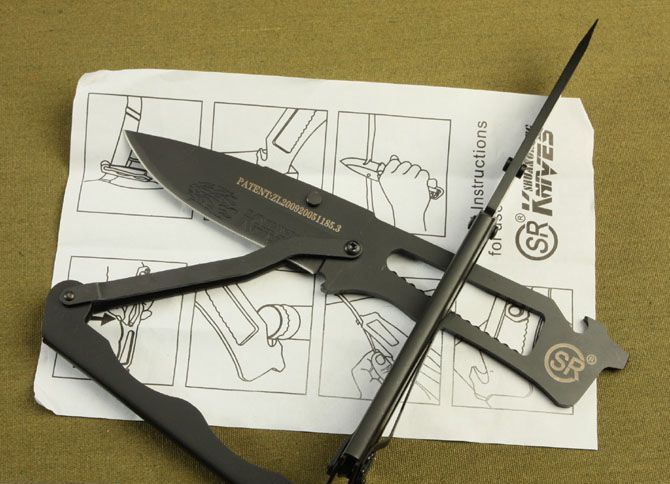 SR-S021多功能救生刀 全 长: 22cm 刃 长: 10cm 刃 宽: 3cm(最宽处) 刃 材: 420 硬 度: 55 表 面: 氧化黑 刃 厚: 0.38cm 柄 长: 12cm 柄 材: 全钢 重 量: 180克
