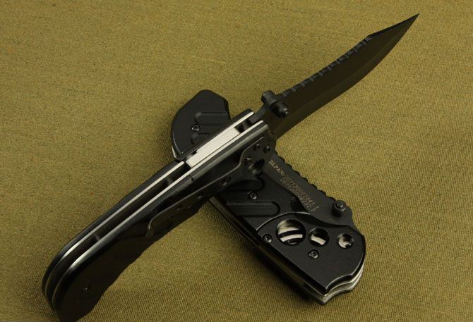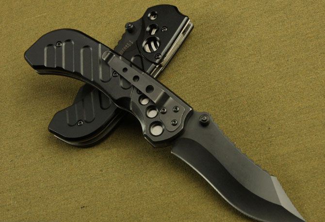 SR268折刀 刃材:440 硬度: 56HRC 全长:20CM 刃长:8.7CM 刃厚: 0.28CM 刃宽:3CM (最宽处) 柄长: 11.2CM 涂层:氧化黑 柄材: 铝 重量:160克 锁定:新奇开锁