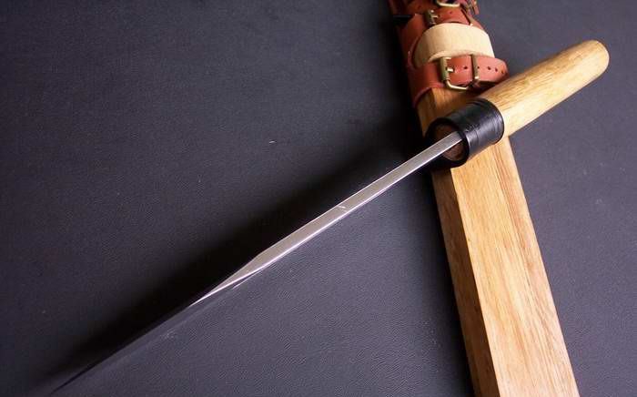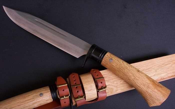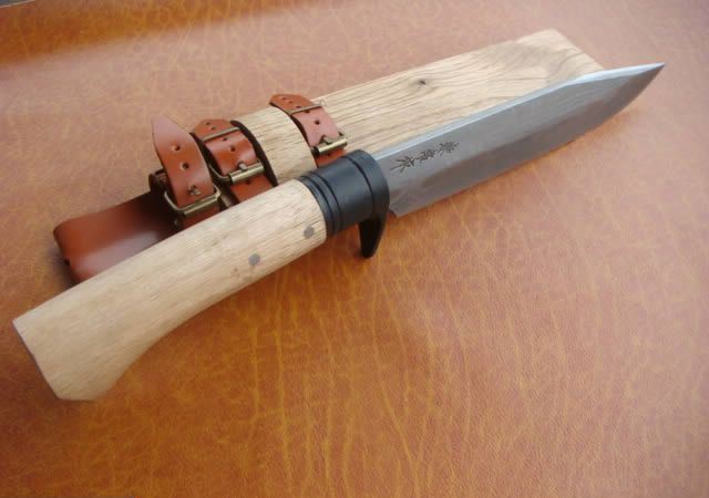 关兼常作守护刀中号花纹钢 全长:30.8 刃长:19.8 刃厚:0.5 刃材: 花纹锻钢 刀刃硬度: 59HRC 重量:560克 刀柄:原木 刀鞘:原木 +真皮+铜扣