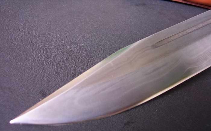 全长:30.8 刃长:19.8 刃厚:0.5 刃材: 花纹锻钢 刀刃硬度: 59HRC 重量:560克 刀柄:原木 刀鞘:原木 +真皮+铜扣