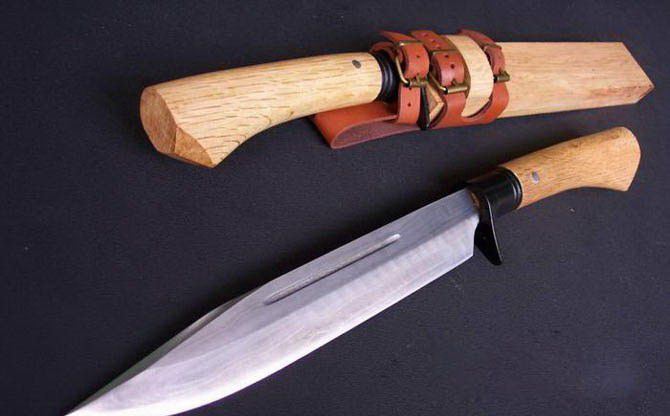 全 长:38cm 刃 长:22cm 刃 厚:6mm 刃 材:锻打花纹钢 柄 材:坚木 硬 度:58Hrc 表 面:砂光 刀 套:牛皮