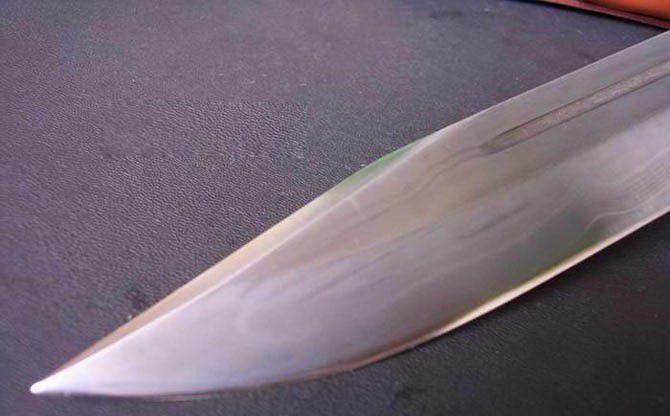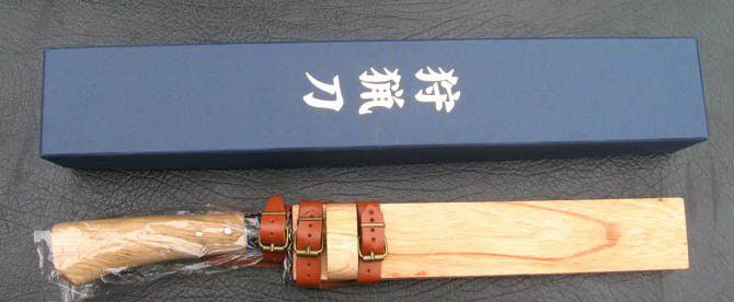 大号关兼常作守护刀(花纹钢) 全 长:38cm 刃 长:22cm 刃 厚:6mm 刃 材:锻打花纹钢 柄 材:坚木 硬 度:58Hrc 表 面:砂光 刀 套:牛皮