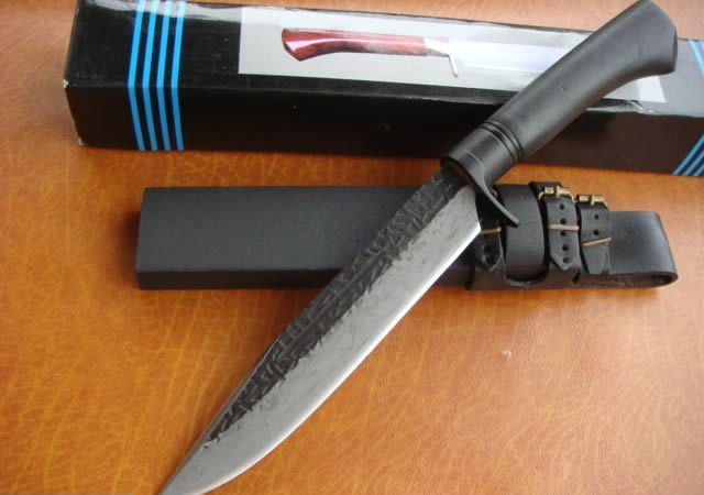精仿关兼常CW-4锻黑狩猎刀 全长:36.5 刃长:21 刃厚:0.6 刃材: 高碳锻钢 刀刃硬度: 59HRC 重量:600克 表面:锻打氧化层 刀柄:原木(表面磨沙,增加防滑和手感) 刀鞘:原木(表面磨沙)+真皮+铜扣