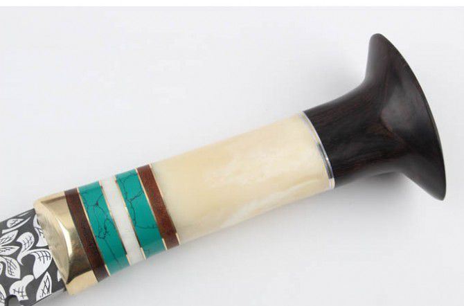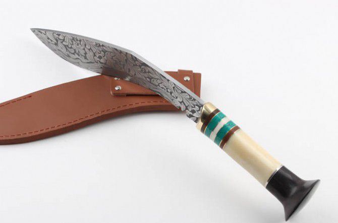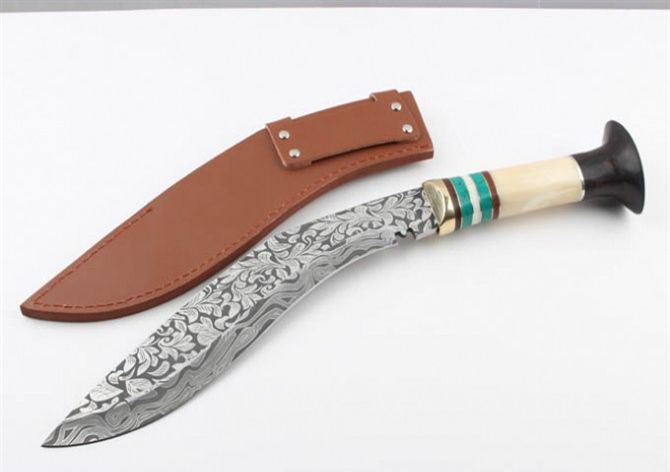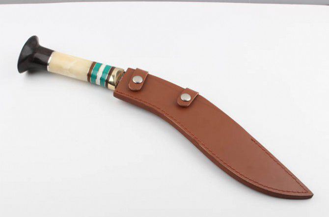 尼泊尔花纹狗腿 全 长:47.5cm 刀 刃:31cm 刃 厚:0.6cm 刃 宽:5CM 柄 长:15.5cm 柄 材:乌木+绿松石+铜头+兽骨 柄 厚:0.3cm 硬 度:57HRC 毛 重:1026克(含皮套) 表 面处理:纯手工锻造 结 构:龙骨结构,刀身贯穿刀柄,非常牢固 、皮鞘、纸盒。 产 地:国内代工