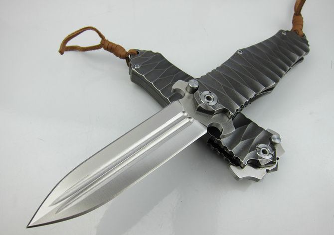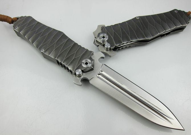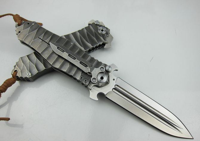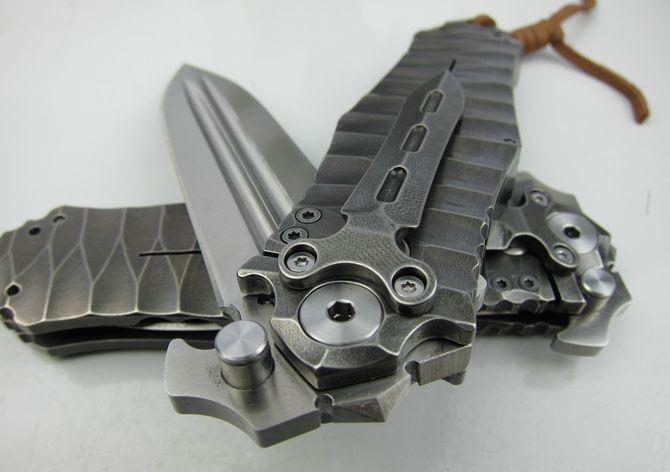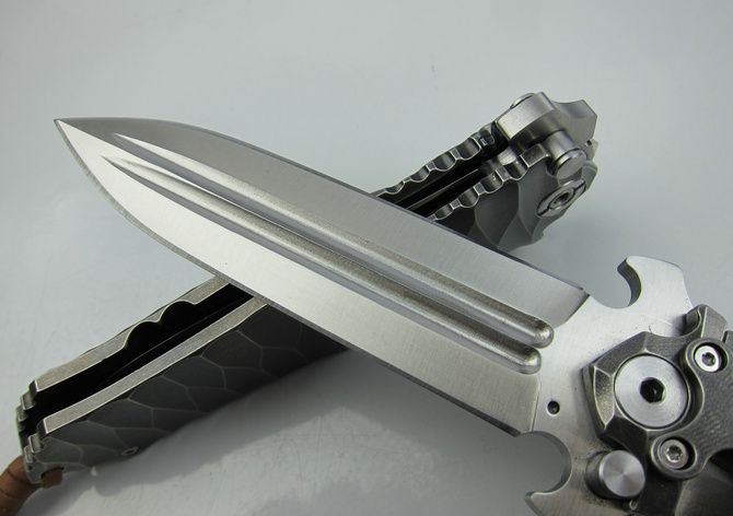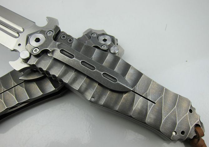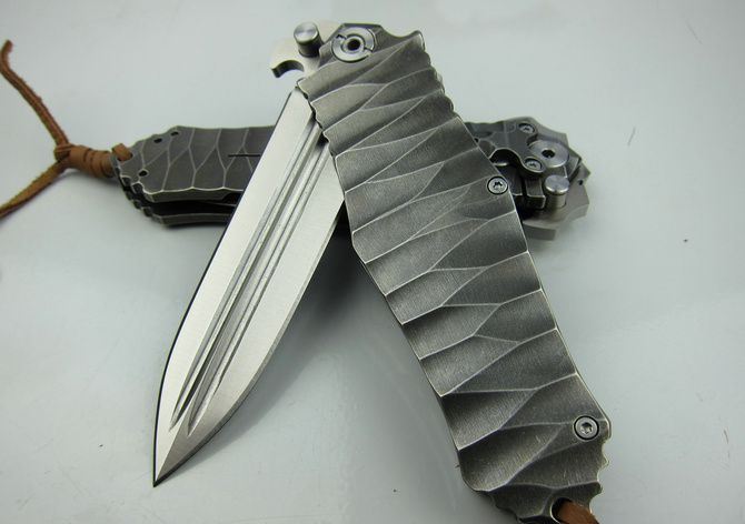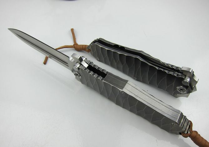 全 长:21.0cm 刃 长:9.5cm 柄 长:12.2cm 刃 宽:2.6cm(最宽处) 刃 厚:3.9mm 刃 材:D2高速钢 硬 度:60-62HRC 刀 柄:钛合金(表面经石洗处理) 表 面:丝光 锁定方式:侧锁 重 量:230克 备 注:钛合金背夹 其 他;品质极高,最受欢迎产品