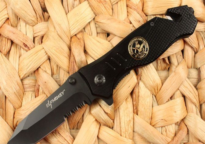 灵猴075折刀 全长:20.5cm 刃长:8.7cm 刃宽:2.5cm 闭合:12cm 刃厚:0.28cm 钢材:440C 硬度:56HRC 净重:145g 表面:氧化黑 柄材:金属铝 锁型:线锁 包装:彩纸盒