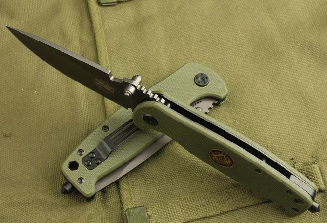 DA7折刀(海军版) 全长:21.5cm 刃长:9cm 柄长:12cm 刃厚:2.8mm 刃宽: 3cm 刃材: 5Cr13 柄材: G10 硬度: 55HRC 净重:120克 毛重:130克 表面处理: 镀钛 锁型: 线锁
