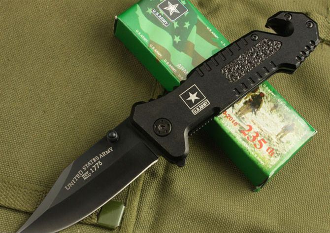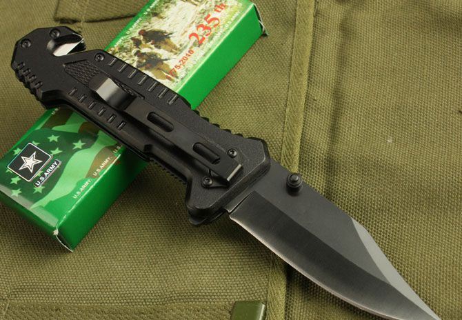 DA6战术折刀 全长:22cm 刃长:9cm 柄长:11.3cm 刃厚:2.8mm 刃宽: 0.28cm 刃材: 3Cr13 柄材: 铝柄 硬度: 54HRC 净重:140克 毛重:150克 表面处理:氧化黑 锁型:边锁