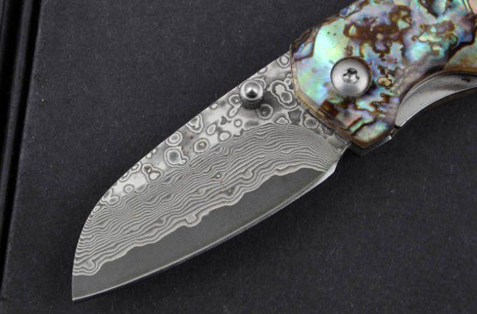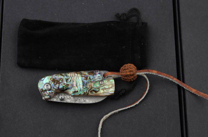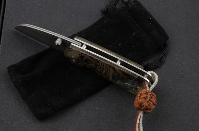 鲍贝掌上明珠大马士革折刀 全 长:11.5cm 刃 长:5cm 柄 长:6.7cm 刃 厚:2.2mm 刃 材:大马士革钢 硬 度:58HRC 刀 柄:鲍贝+钢片 表 面:大马士革花纹 锁定方式:线锁 重 量:60.0克(含绒袋)