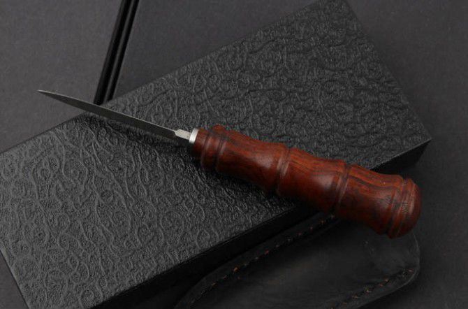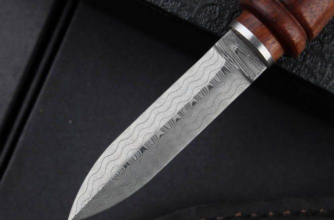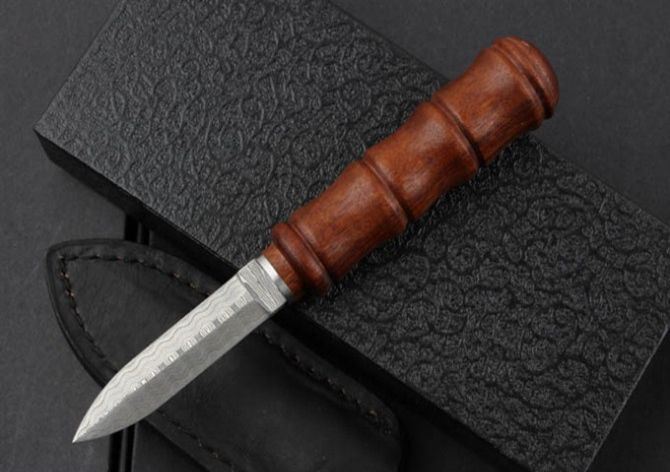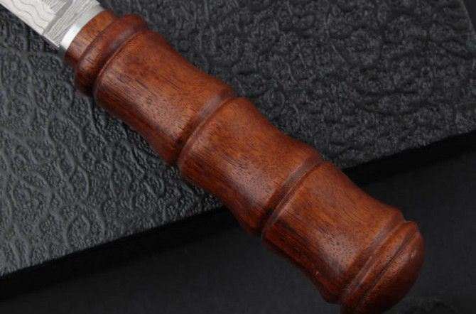 大马士革足迹茶刀 全 长:145mm 刃 长:60mm 柄 长:85mm 刃 宽:13mm 刃 厚:2mm 刃 材:大马士革 重 量:122g(含包装) 硬 度:58HRC 表 面:钢本色 柄 材:黄檀木 其 他:配牛皮套