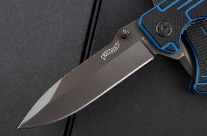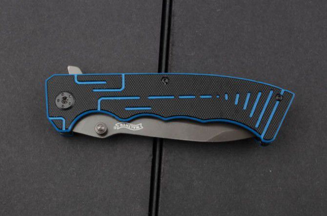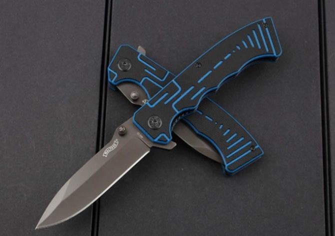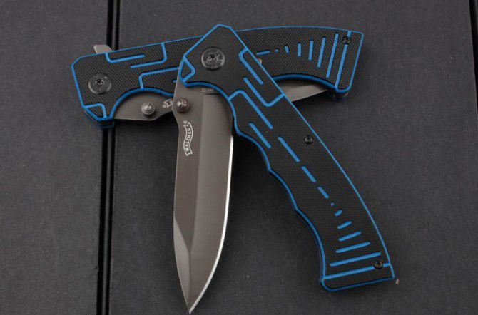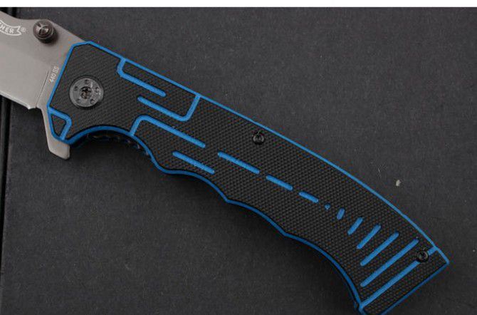 新版瓦尔特-蓝黑部队 全长:22.5cm 刀刃:9.6cm 刃厚:0.34cm 刃宽:2.5cm 柄长:12.7cm 硬度:58HRC 净重:139g 材料:3Cr13 柄材:黑蓝G10 锁型:侧锁 其他:高品质