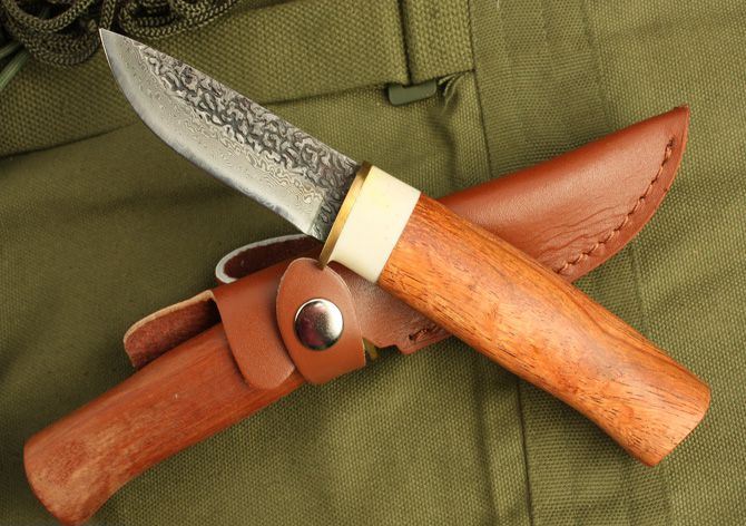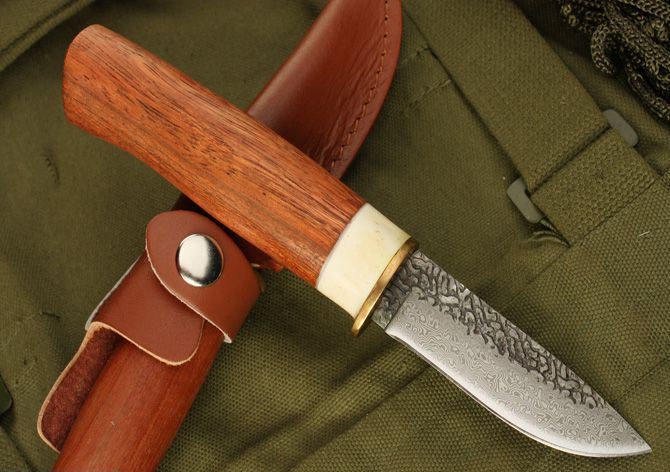 手工兽骨铜头防护刀(花纹钢) 全 长: 21.2cm 刃 长: 8.5 刃 宽: 2.5cm(最宽处) 柄 长: 11.6cm 刃 厚: 0.32cm 刃 材: 花纹钢 硬 度: 58RHC 表 面: 锻打花纹和黑纹 柄 材: 兽骨+铜头+坚木 重 量: 130克(含套) 其 他:手工水磨,刃口锋利,可刮汗毛, 真皮刀套。