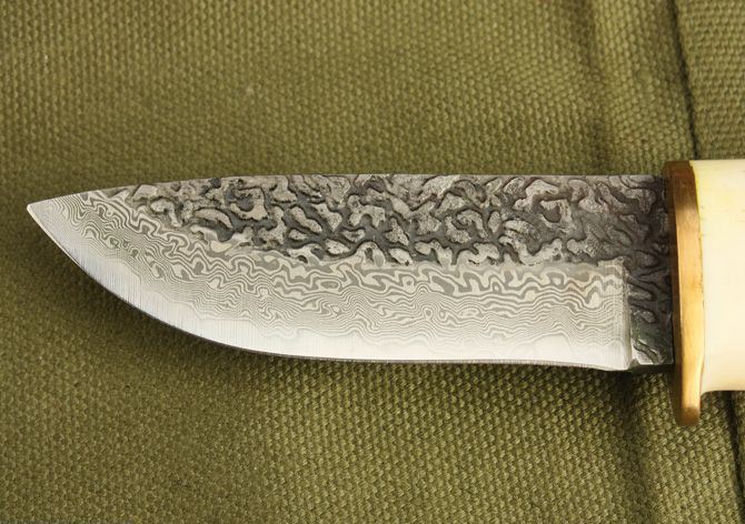 全 长: 21.2cm 刃 长: 8.5 刃 宽: 2.5cm(最宽处) 柄 长: 11.6cm 刃 厚: 0.32cm 刃 材: 花纹钢 硬 度: 58RHC 表 面: 锻打花纹和黑纹 柄 材: 兽骨+铜头+坚木 重 量: 130克(含套) 其 他:手工水磨,刃口锋利,可刮汗毛, 真皮刀套。