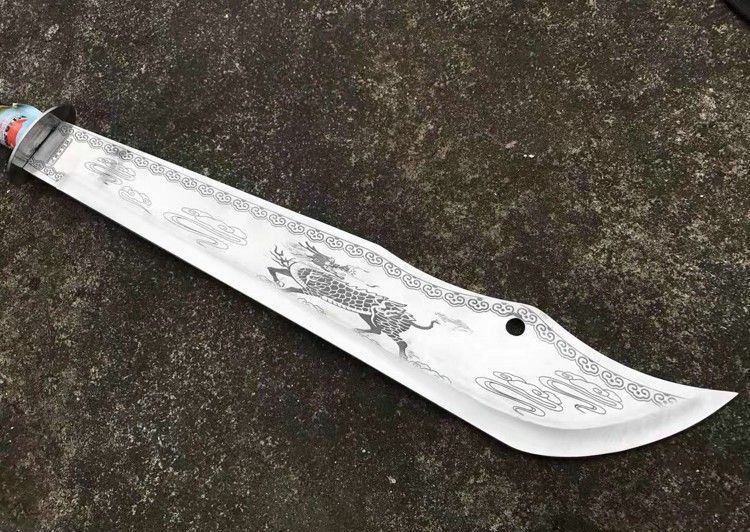 三节麒麟风水大刀 全 长:1590mm 刃 长:510mm 刃 宽:100mm(最宽) 刃 厚:4mm 刃 材:3Cr13Wov 硬 度:55HRC 柄 材:全钢氧化黑 净 重: 3200克 刀 鞘:黑色皮套 表 面:钢本色(电脑雕刻)