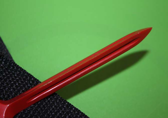 战俘箭(红色) 总长:17.8CM材料 一体不锈钢 硬度:58HRC 全钢压铸一次成型 三棱小刃,三血槽,配有的刀鞘很方便绑在胳膊上和腿上,极具隐蔽性,全不锈钢制造!防身最佳选择。
