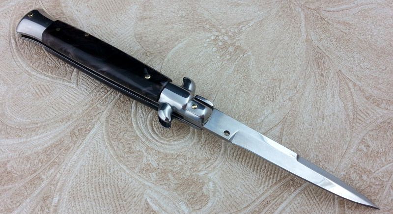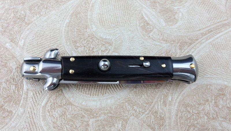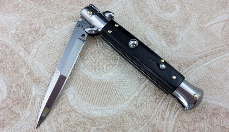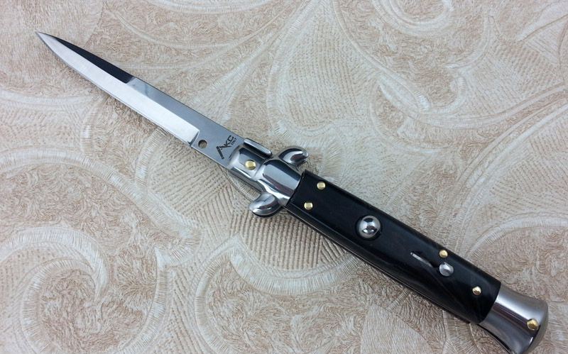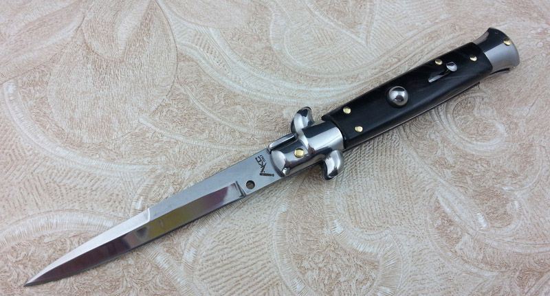 9寸意大利黑手党跳刀(仿牛角) 全 长:22.9CM 刃 长:10.2CM 柄 长:325MM 刃 厚:3.0mm 刃 材:440 刀 柄:亚力克黑牛角 开刀方式:弹簧 重 量:150克 2014新款9寸AKC意大利黑手党-赌徒跳刀,在电影"教父"里出尽了风头!枪刺刃的黑手党侧跳,仿牛角亚力克柄,弹力超强,锁定到位,440枪刺刀刃镜面,带有保险装置,刀护手处暗藏闭合开关,出口产品,质量保证!满足把玩和收藏需要