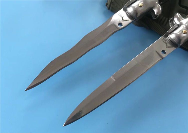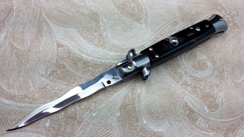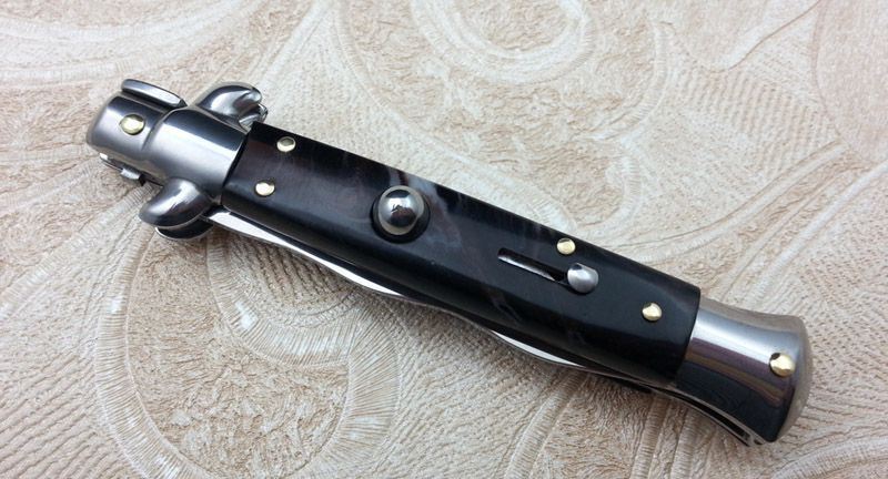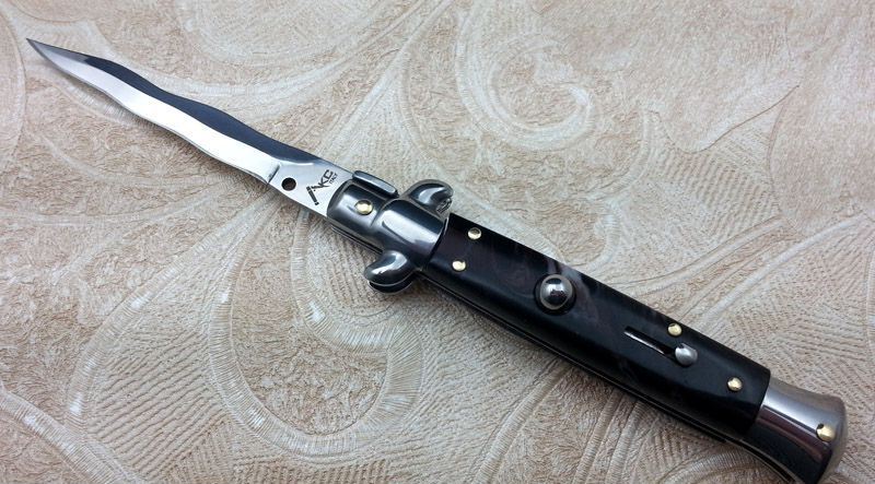 全 长:22.9CM 刃 长:10.2CM 柄 长:325MM 刃 厚:3.0mm 刃 材:440 刀 柄:亚力克黑牛角 开刀方式:弹簧 重 量:150克 2014新款9寸AKC意大利黑手党-赌徒跳刀,在电影"教父"里出尽了风头!枪刺刃的黑手党侧跳,仿牛角亚力克柄,弹力超强,锁定到位,440蛇形刀刃镜面,带有保险装置,刀护手处暗藏闭合开关,出口产品,质量保证!满足把玩和收藏需要
