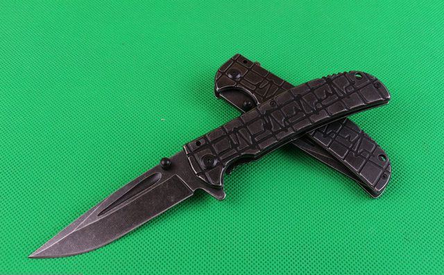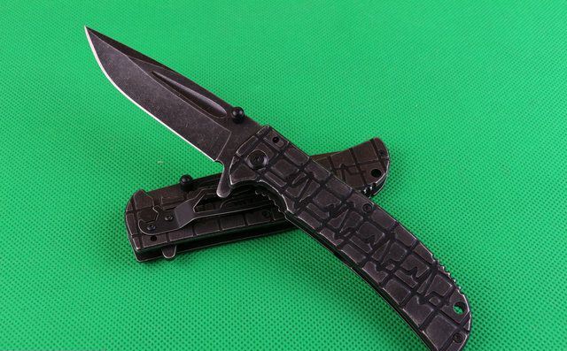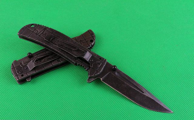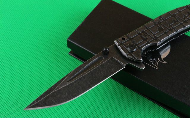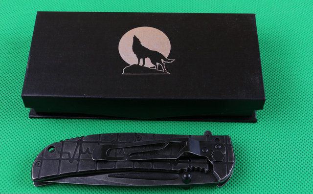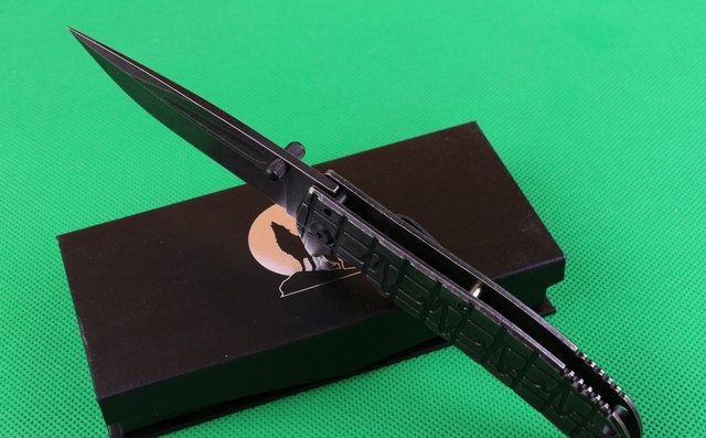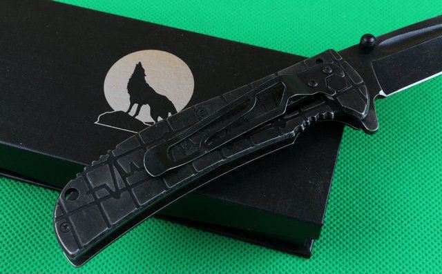 苍狼电波快开折刀 全 长:230mm 刃 长:90mm 柄 长:126mm 刃 宽:28mm 刃 厚:3.4mm 刃 材:440 重 量:250(含包装) 硬 度:57HRC 表 面:镀黑钛 柄 材:全钢 锁 型:线锁 其 他:配厂盒