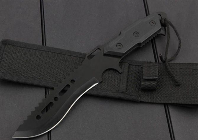 LOL黑魔猎刀 全 长:303mm 刃 长:180mm 柄 长:125mm 刃 宽:39mm 刃 厚:3.0mm 刃 材: 5cr15mov 重 量:299g(含包装) 硬 度:56 HRC 表 面:氧化黑 柄 材:pvc 锁 型:定锁 其 他:配纸盒 尼龙套