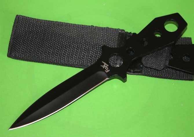 FOX(狐狸)潜水飞镖黑色 长 度:22.5cm 刃 长:11.5cm 最 宽:2.5cm 刃 厚:3.5mm 总 重:40克 表 面:发黑 其 它:1支装 刀 套:尼龙套