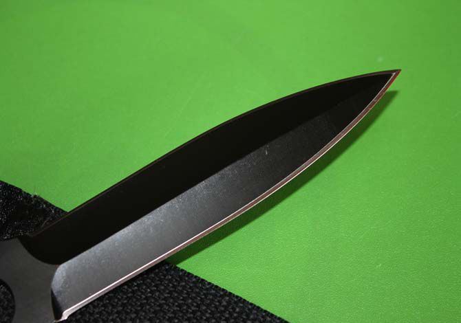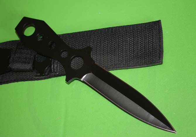 长 度:22.5cm 刃 长:11.5cm 最 宽:2.5cm 刃 厚:3.5mm 总 重:40克 表 面:发黑 其 它:1支装 刀 套:尼龙套