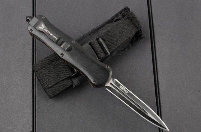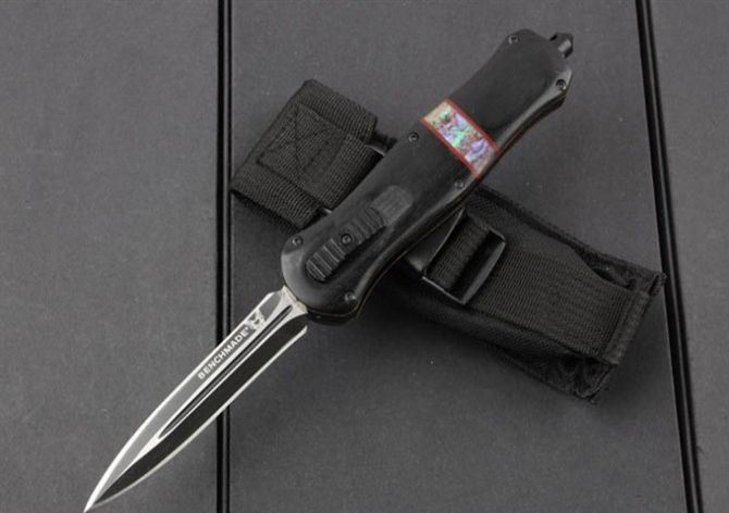 新版A109蝴蝶刀 全 长: 22.9cm 刃 长: 9.7cm 刃 厚: 1.6mm 刃 材: D2 硬 度: 59HRC 刀 重: 204g 毛 重: 287g 表 面: 镀钛 柄 材: 锌铝合金+黑檀木+彩贝壳 刀 鞘: 尼龙 锁 闭: 直出弹簧刀