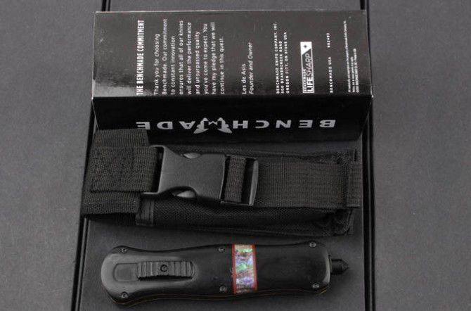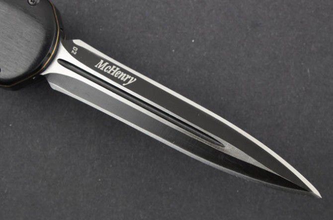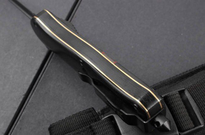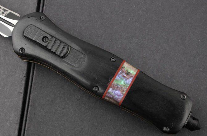 全 长: 22.9cm 刃 长: 9.7cm 刃 厚: 1.6mm 刃 材: D2 硬 度: 59HRC 刀 重: 204g 毛 重: 287g 表 面: 镀钛 柄 材: 锌铝合金+黑檀木+彩贝壳 刀 鞘: 尼龙 锁 闭: 直出弹簧刀