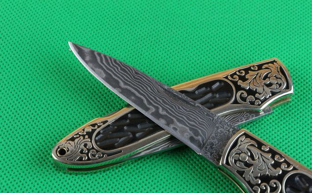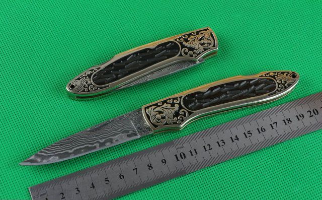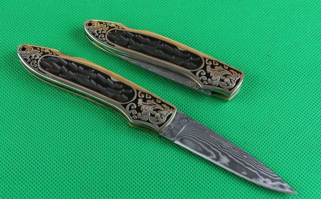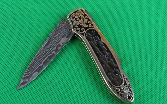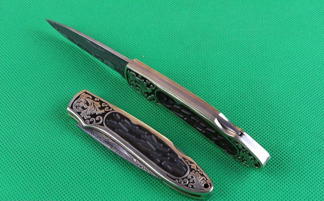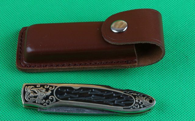 金花起舞折刀 全 长: 20.2cm 刃 长: 8.1cm 刃 宽: 2.1cm 刃 材: 大马士革钢 硬 度: 58 表 面: 雕花 刃 厚: 0.28cm 柄 长: 11.5cm 柄 材: 黄铜精镶黑檀木 净 重:120克 锁 定: 制尾 其 他: 配皮套