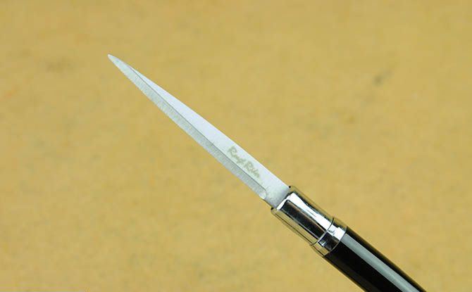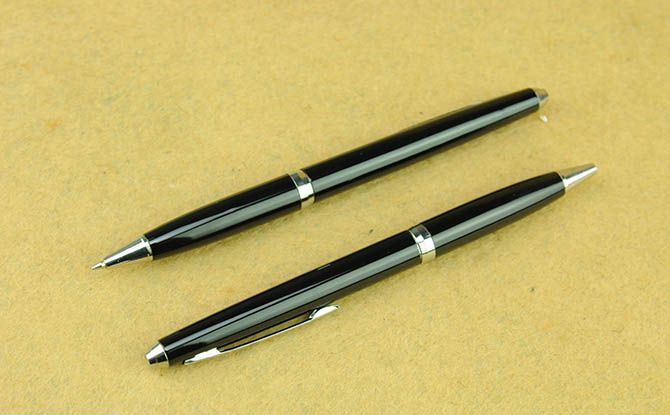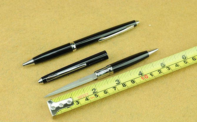 总长:13.5cm 刃长: 5.6cm 刃厚:0.1cm 刃宽:0.6cm 刃面:砂光 重量:17克 巧妙地将圆珠笔和小刀功能组合成一体,小巧便携,是理想的防卫工具,笔杆采用薄铜管。
