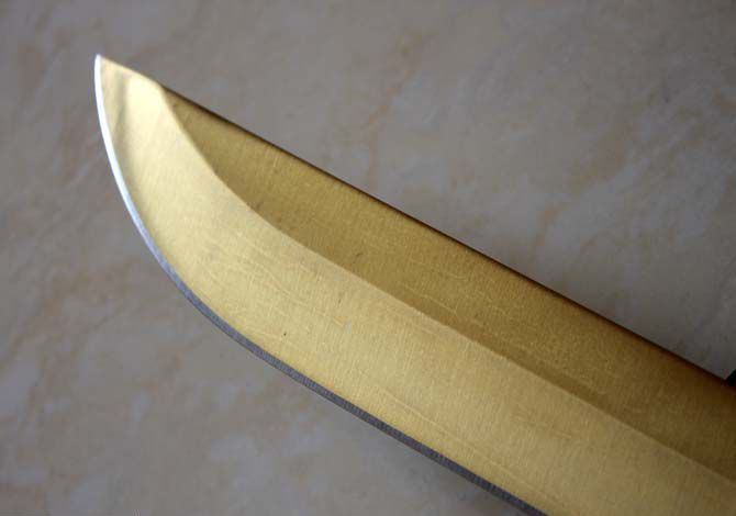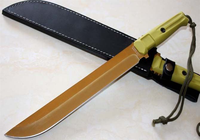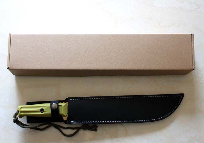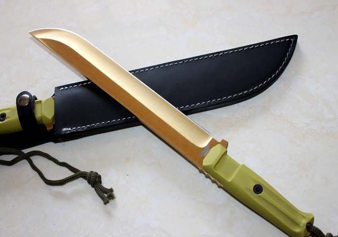 全 长:410mm 刃 长:28mm 柄 长:130mm 刃 宽:35mm 刃 厚:6mm 刃 材:5Cr13Mov 重 量:680g(含包装) 硬 度:57HRC 表 面:镀钛金 柄 材:ABS 锁 型:定锁 其 他:配皮套和纸盒