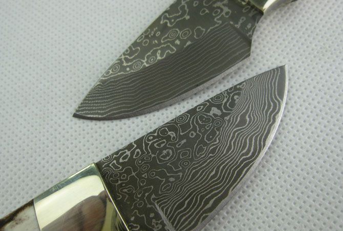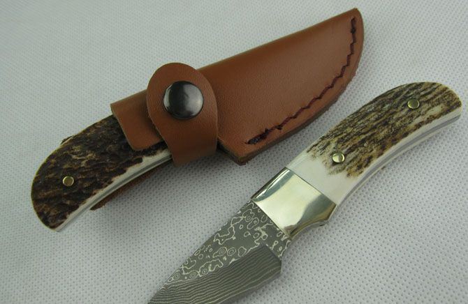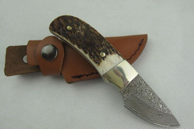 大马士革鹿角小甲虫直刀 全 长:12.5cm 刃 长:4.8cm 柄 长:7.5cm 刃 厚:2.8mm 刃 材:大马士革钢 硬 度:57HRC 刀 柄:鹿角+铜头+铜钉 表 面:大马士革花纹 重 量:80.0克 备 注:带真皮套