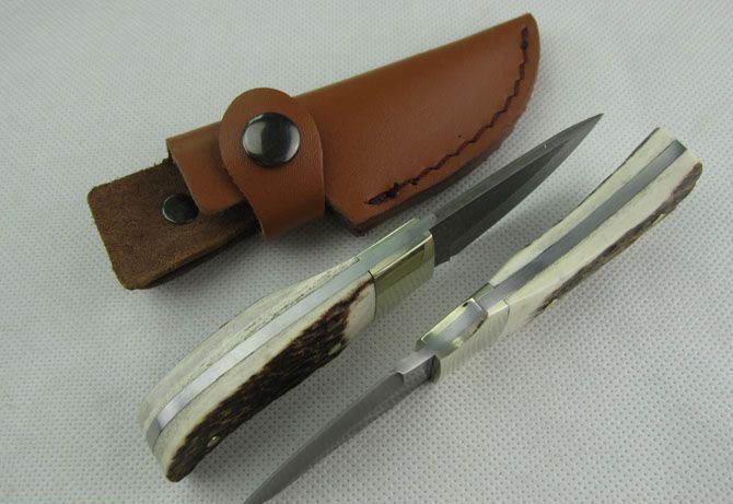 全 长:12.5cm 刃 长:4.8cm 柄 长:7.5cm 刃 厚:2.8mm 刃 材:大马士革钢 硬 度:57HRC 刀 柄:鹿角+铜头+铜钉 表 面:大马士革花纹 重 量:80.0克 备 注:带真皮套