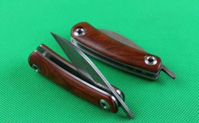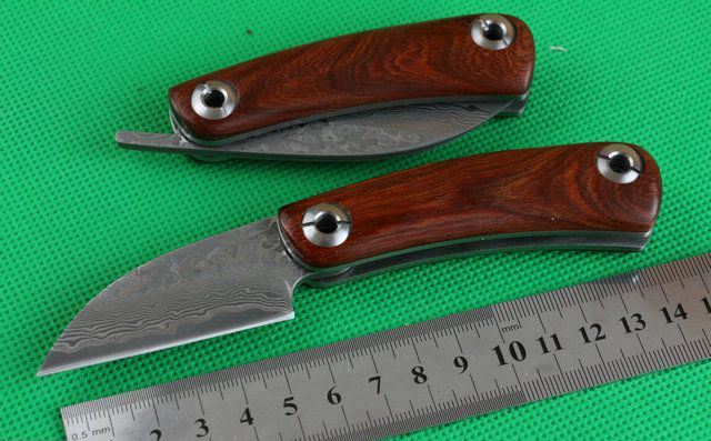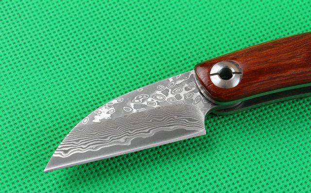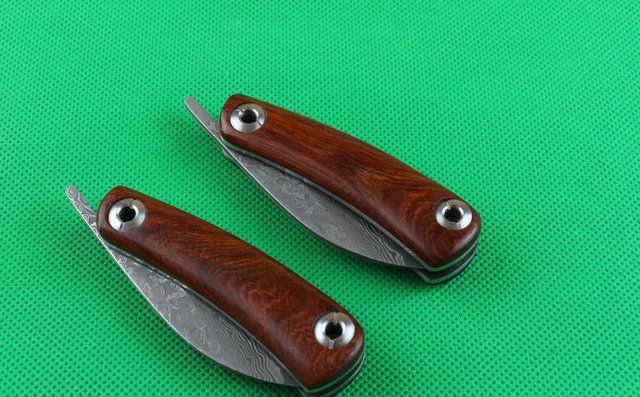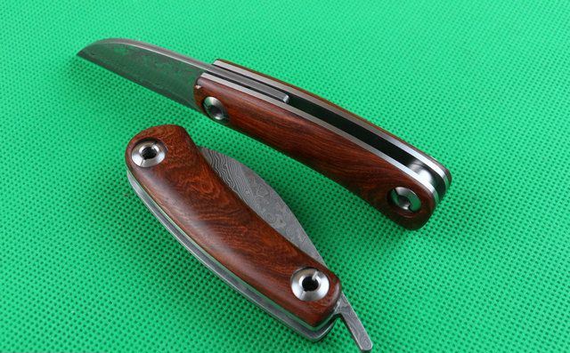大马士革黄檀木小剃刀 全 长:150mm 刃 长:58mm 柄 长:90mm 刃 宽:25mm 刃 厚:3.3mm 刃 材:大马士革钢 重 量:120g (含包装) 硬 度:58-60HRC 表 面:原有大马士革纹 柄 材:天然黄檀木手柄,木纹纹路清楚. 锁 型:无锁。 螺 丝:所有螺丝420不锈钢硬度HRC45。内置铜垫,刀身坚固,不会摇头.黄檀木和钢片之间不会有空隙,是刀匠做好刀的可见之处. 结 构:无锁。 其 它;黄盒包装.