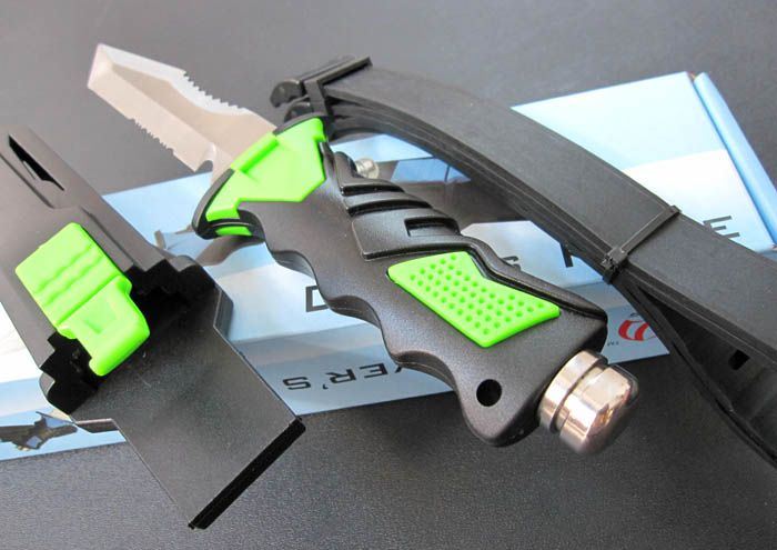 军用潜水刀(绿色T头双齿) 全 长: 25.5cm 刃 长: 12.5cm 刃 厚: 3.5mm 刃 材: ATS-34 硬 度: 58HRC 表 面: 砂光 柄 材: 橡塑 刀 鞘: ABS
