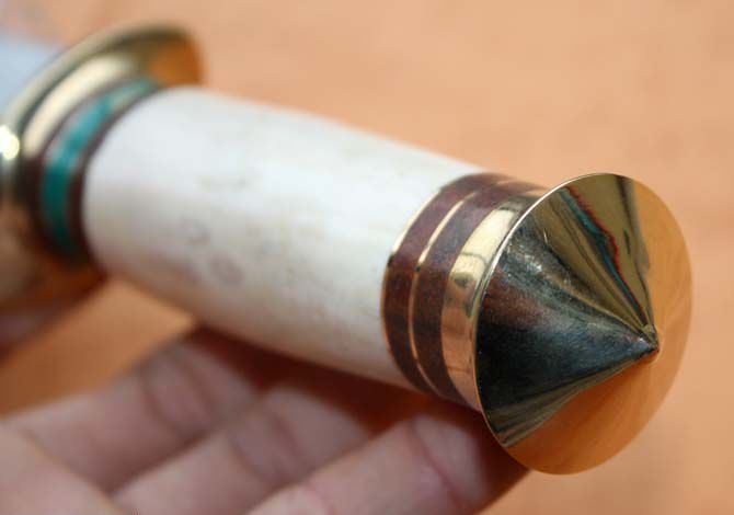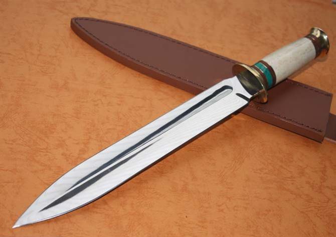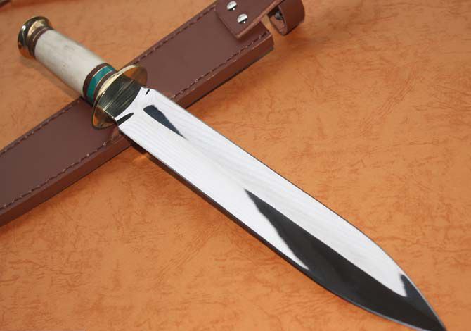 双铜头兽骨双锋直刀 全长:42.5cm 刀刃:27.5cm 刃厚:0.35cm 刃宽:4CM 柄长:12.5cm 柄材:绿松石+铜头+兽骨 柄厚:0.3cm 刃材:7Cr17 硬度:57HRC 毛重:700克(含皮套) 表面:超镜光 结构:龙骨结构,刀身贯穿刀柄,非常牢固 、皮鞘、纸盒。 产地:国内代工