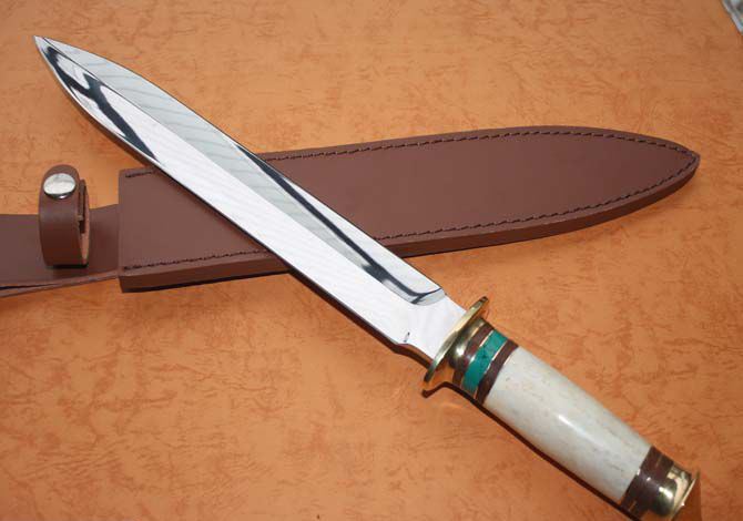全长:42.5cm 刀刃:27.5cm 刃厚:0.35cm 刃宽:4CM 柄长:12.5cm 柄材:绿松石+铜头+兽骨 柄厚:0.3cm 刃材:7Cr17 硬度:57HRC 毛重:700克(含皮套) 表面:超镜光 结构:龙骨结构,刀身贯穿刀柄,非常牢固 、皮鞘、纸盒。 产地:国内代工