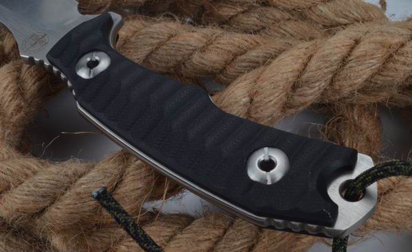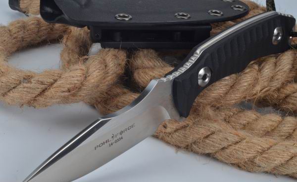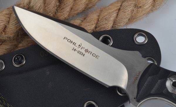 POHL刃物战术小直刀 全长:225mm 刃长:105mm 柄长:120mm 刃宽:31mm 刃厚:5mm 刃材:7CR13 柄材:精雕G10 硬度:59HRC 表面:砂光拉丝 锁型:直锁 刀套:K鞘 包装:纸盒 重量:300g 产地:中国代工 附件:实心战术绳 其他:高品质手工数控制作