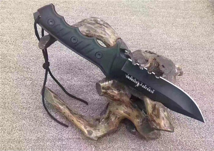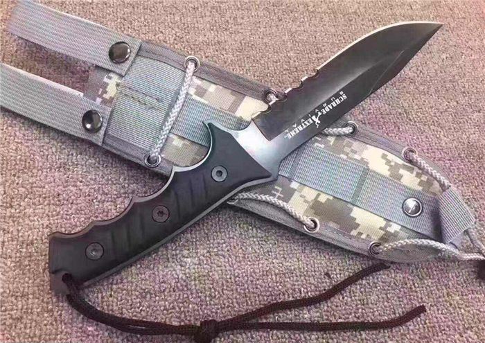 施拉德.极端帝国野战求生刀I号(胶柄) 全 长:30cm 刃 长:15cm 柄 长:14cm 刃 厚:5.5mm 刃 材:5CR13 硬 度:57HRC 净 重:410g 总 重:700g(包括纸盒和刀鞘) 柄 材:工和橡胶 表 面:发黑钛 刀 鞘:CORDURA(科杜拉)