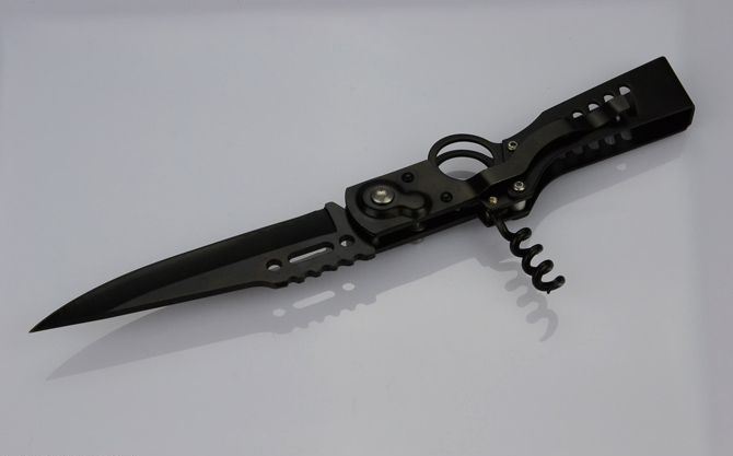 全 长:21.5cm 刃 长:9.5cm 柄 长:12.0cm 刃 宽:2.3cm(最宽处) 刃 厚:2.4mm 刃 材:440 硬 度:55HRC 刀 柄:钢柄 表 面:发黑 锁 闭: 快开按纽有保险锁,手柄处有开关 重 量:98克 备 注:带背夹,开瓶器