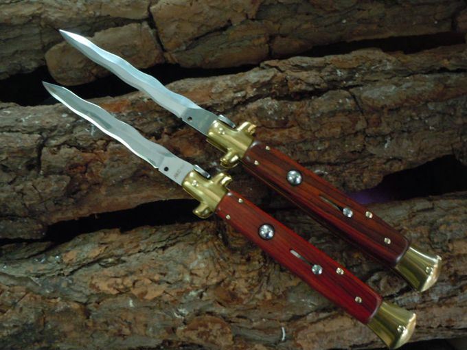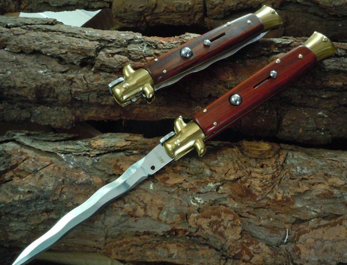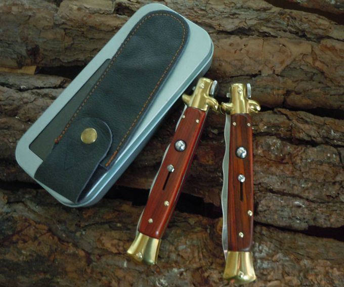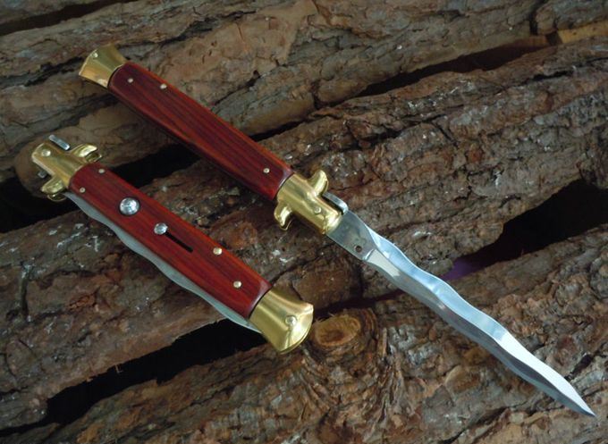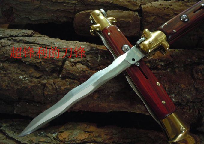 意大利黑手党使用的经典刀具-赌徒跳刀,在电影"教父"里出尽了风头!11英寸(28CM)天然黄檀木柄的黑手党水波刃侧跳,出刀迅速,锁定稳固,具有超强的穿刺力!带有保险装置,刀护手处暗藏闭合开关,配备牛皮软套,AKC公司出口产品,性能优越,满足把玩和收藏的需要