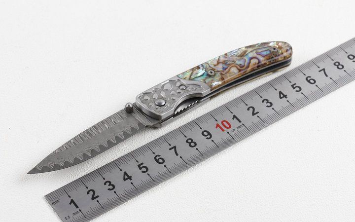 鲍贝大马士革收藏折刀 全 长:16.5cm 刃 长:6.5cm 柄 长:9.5cm 刃 厚:2.0mm 刃 材:大马士革钢 硬 度:57HRC 刀 柄:鲍贝 表 面:大马士革花纹 锁定方式:侧锁 重 量:170.0克 备 注:礼品盒