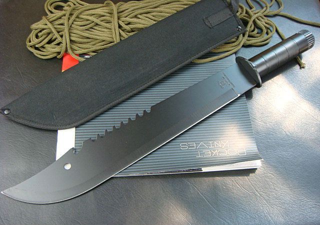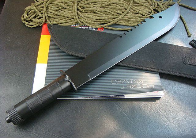全长:50.5 刀长:36 刃厚:0.3 刃宽:6.0(最宽处) 表面: 高温黑漆 硬度:56 重量:510G 刃材:420 刀鞘:耐磨尼龙刀鞘 特点: 此刀外观非常漂亮,手柄中空, 可以储存救生用品. 野外生存、防身探险必备